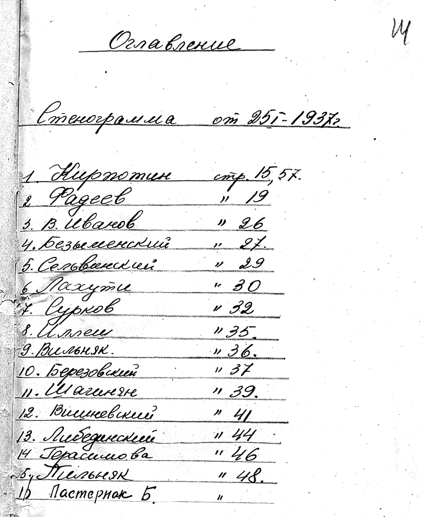 19 Иллюстрация: оглавление стенограммы заседания Президиума ССП от 25 января 1937 года (РГАЛИ Ф. 631. Оп. 15. Ед. хр. 168. Л. 14).