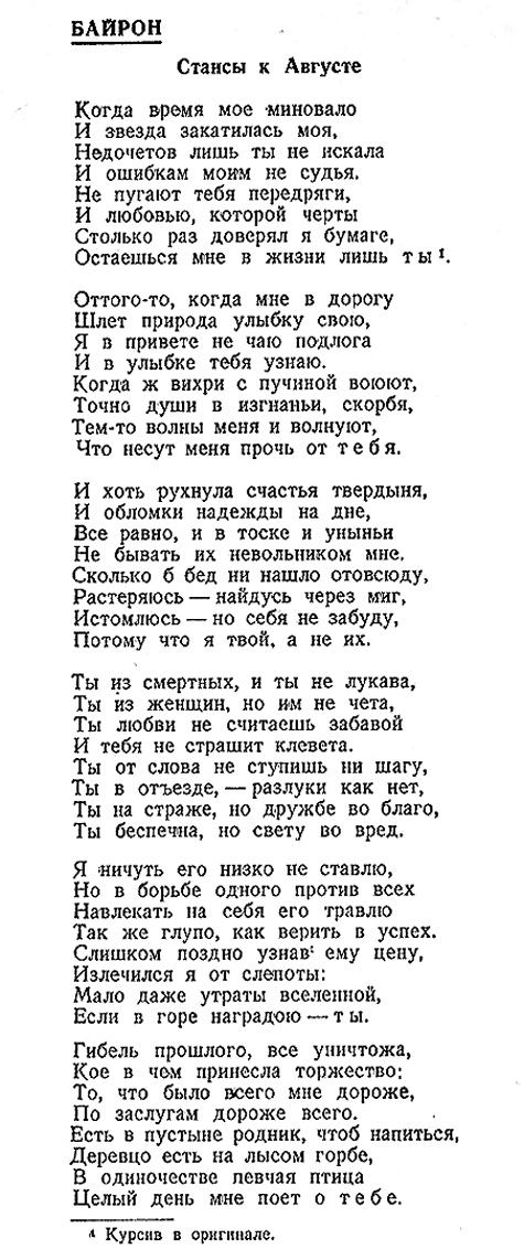 Третий друг. Совершенно верно. Это — юношеское произведение Байрона. Позвольте познакомить вас с его происхождением. Стихотворение называется “Стансы к Августе” и обращено к сводной сестре Байрона...».